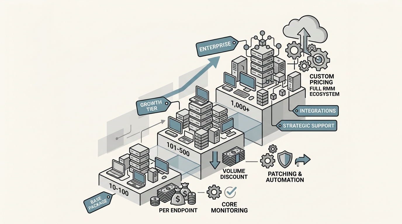 Like most RMM tools, Datto offers volume discounts. The per-endpoint price drops as you add more devices. While Datto doesn't publish the exact breakpoints, the industry standard typically looks something like this: